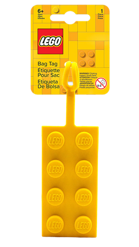Omvat een siliconen bagagelabel in de vorm van een LEGO steen, met een riempje en ruimte achterop om je contactgegevens op te schrijven.