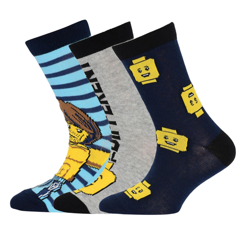 Zachte en comfortabele LEGO sokken met 3 paar per pakket. Een blauw, groen en donker blauw paar sokken met verschillende LEGO opdrukken.
