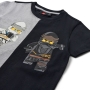 Geweldig LEGO NINJAGO T-shirt met een kleursplit aan de voorkant. Er zijn twee ninja's op de voorkant gedrukt Zane en Cole, die elk aan hun kant van het midden staan. De achterkant van het kinder-T-shirt is effen zwart. Dit T-shirt voor kinderen is gemaakt van biologisch katoen en heeft een klein LEGO-logo op de zijkant. In de halsopening bevindt zich een kleine ribboord.