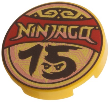 Ronde LEGO Tegels van 2x2 noppen groot met rode NINJAGO banier en 15 jaar opdruk.