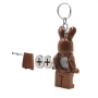 Een LEGO Sleutelhanger van een grote LEGO Chocolade Konijn minifiguur met beweegbare armen, een helder LED lampje in beide voeten en een knop op het lichaam om de lampjes aan te zetten. Heel leuk voor aan een (school-)tas, jas of sleutelbos.