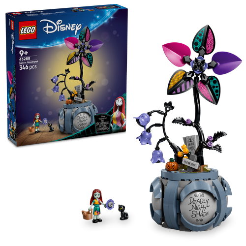 Deze bloemenbouwset, geïnspireerd op Tim Burton's The Nightmare Before Christmas, stimuleert urenlang speelplezier met 2 LEGO Disney personages: Sally eneen kleine zwarte kat. De set bevat een bloempot met 2 bouwbare bloemen, verborgen kamers en kleurrijke stickers aan de binnen- en buitenkant. Binnenin vind je ook een mand, een ketel, een bouwbare tafel en nog veel meer. De personages kunnen na het spelen worden opgeborgen in de pot. Dit bouwspeelgoed voor meisjes en jongens vanaf 9 jaar is een leuke cadeautip voor een verjaardag of de feestdagen. Zet deze bloempot neer naast ander LEGO ǀ Disney bouwspeelgoed (apart verkrijgbaar) om een verzameling uit te breiden. Dit displaymodel nodigt ook uit tot fantasierijk spelen.