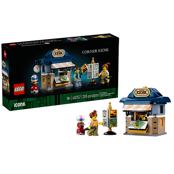 • Wat zit er in de doos – alles wat je nodig hebt om een ouderwetse kiosk, een displayzuil en een kauwgomballenautomaat te bouwen, plus minifiguren van een verkoper en een klant