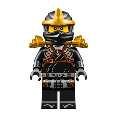 LEGO Cole ZX Legacy Update minifiguur uit het subthema Ninjago Legacy. Cole heeft een donkerblauwgrijze schubbenpantser met roodbruine banden en gouden gespen en versieringen aan. Cole komt met pearl gouden schouderstukken met ruimte voor 2 zwaarden.
