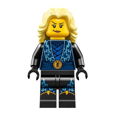 LEGO Meester van de Bliksem minifiguur uit het subthema Ninjago Legacy. De Meester van de Bliksem minifiguur draagt een donkerblauwe torso mantel over een blauwe tuniek, metallic lichtblauwe bliksem op de wijde zomen met een gouden gesp-patroon en heeft lichtgeel halflang golvend haar met middenscheiding.